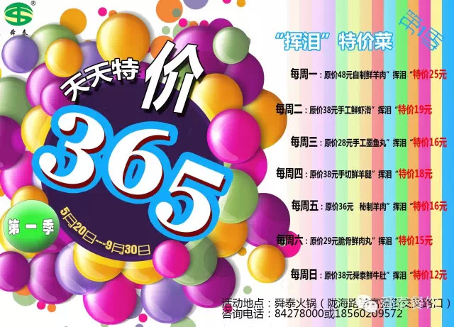 A、特價菜活動說明:舜泰火鍋每天推出一道“揮淚”特價菜,每桌限點一份,具體如下:
